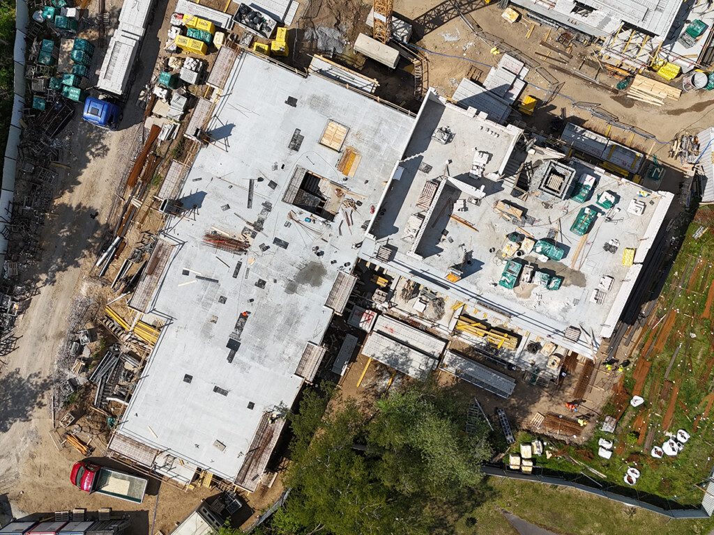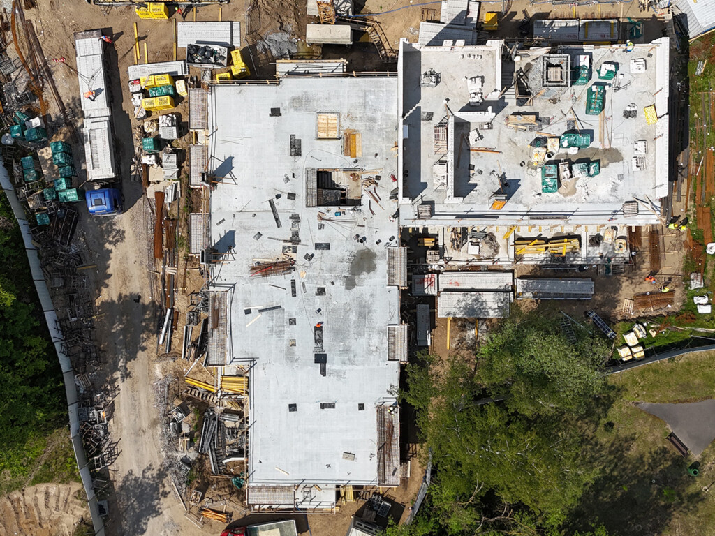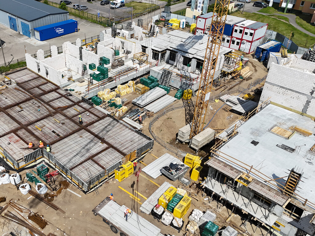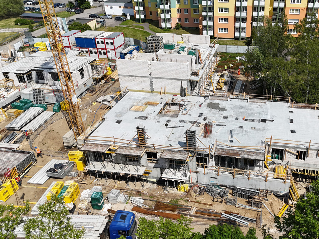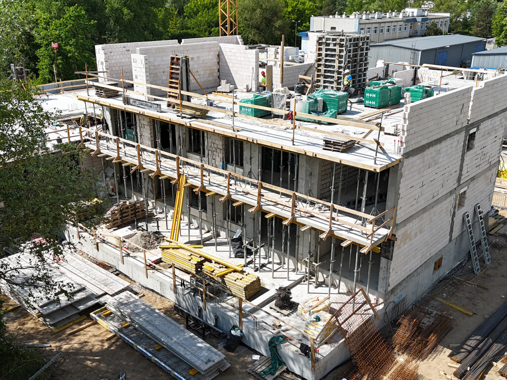 Prace na budowie postępują dynamicznie, a mimo zmiennej pogody, działamy bez przerwy. W obu budynkach zakończyliśmy już wznoszenie parteru, a obecnie pracujemy nad pierwszym piętrem.